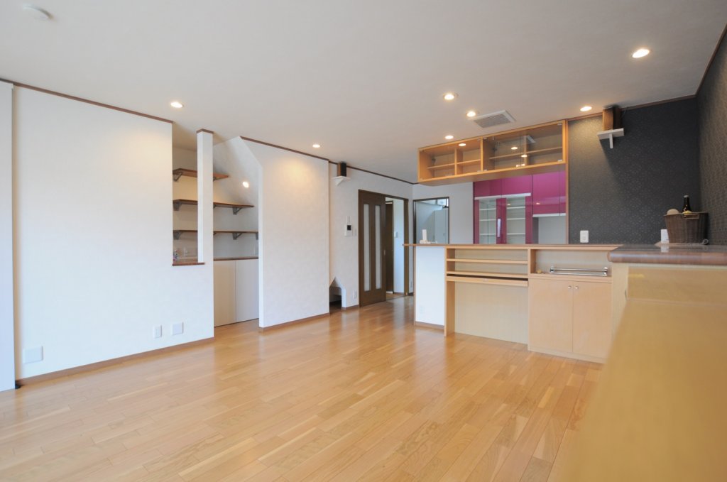 2階もワンフロア―に。広々としたLDKになりました。インパクトのあるビビットカラーのキッチンが映え明るい気分にしてくれます。