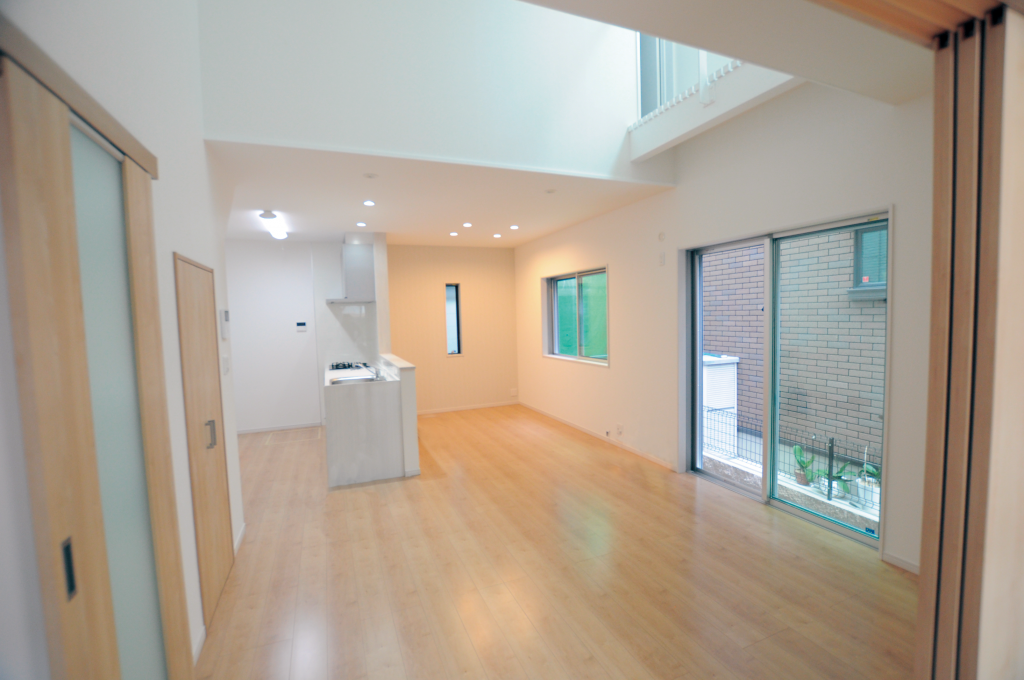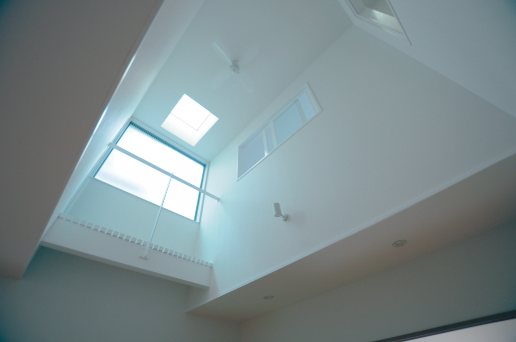 リビングには吹き抜けを作り、はめ込み窓と天窓から光を取り込みました。