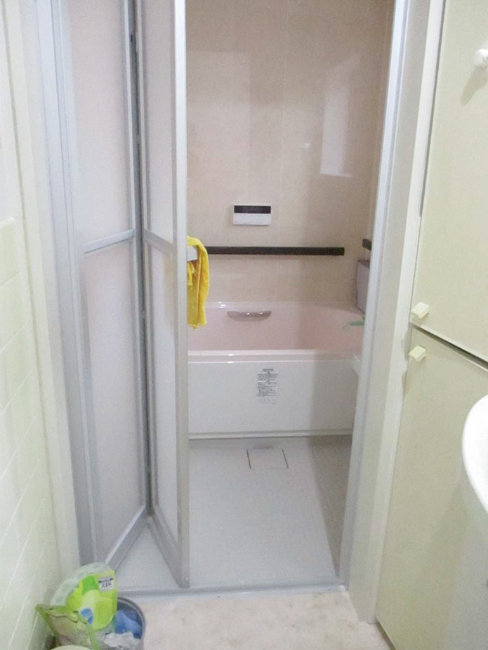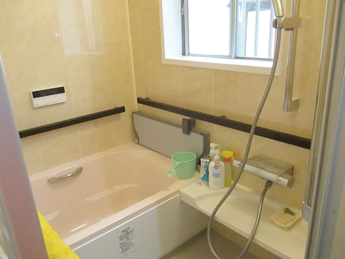 手摺り付のお風呂。入口は段差もなく、折れ戸は出入りしやすい。もちろん床は濡れていても滑りにくい