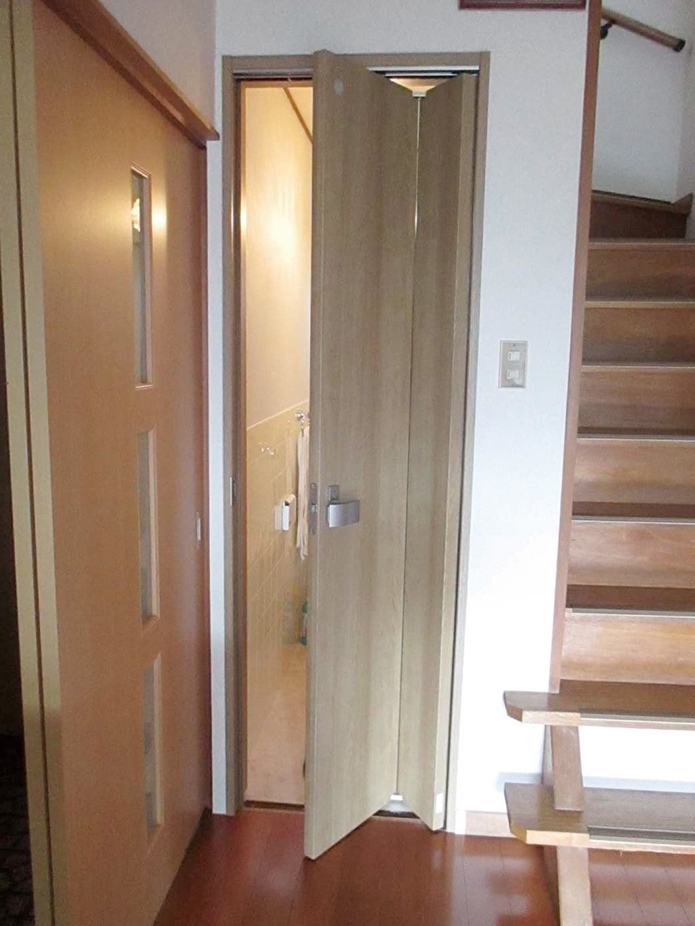 トイレの出入口もフラットに!引戸にするスペースがないので、折れ戸に。