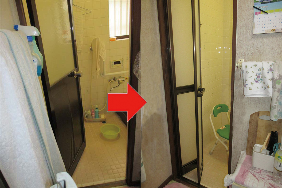 お風呂のドアを開き戸から折れ戸に。入浴中万が一洗い場で倒れた時、内開きの1枚扉だと、外側から開けれない事態がおこることも!!