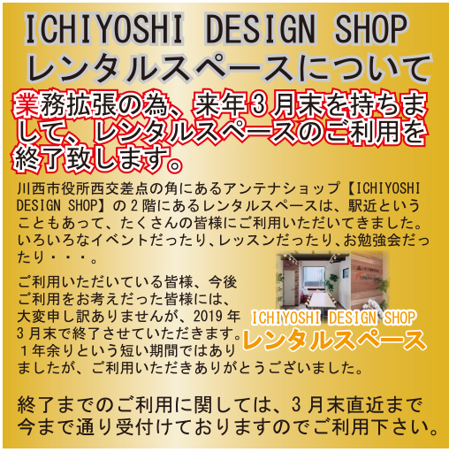 川西市役所交差点の角にあるアンテナショップ【ICHIYOSHI DESIGN SHOP】の2階にあるレンタルスペースは、駅近ということもあって、たくさんの皆様にご利用いただいてきました。いろいろなイベントだったり、レッスンだったり、お勉強会だったり・・・。