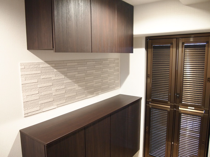 玄関収納の間の壁面には調湿&消臭効果のあるタイル【エコカラット】を貼りました。高級感のある玄関廻りになりました。