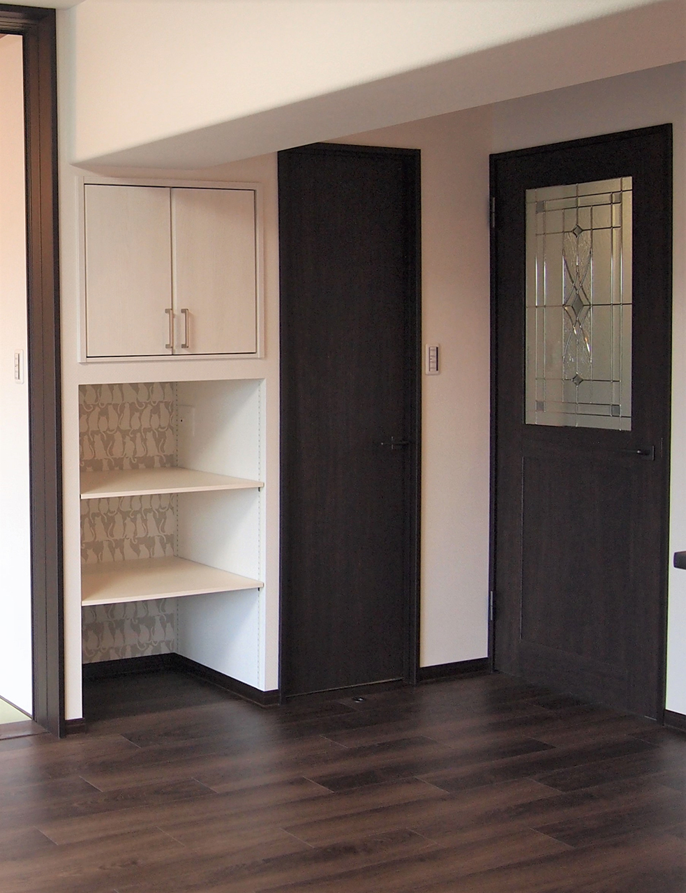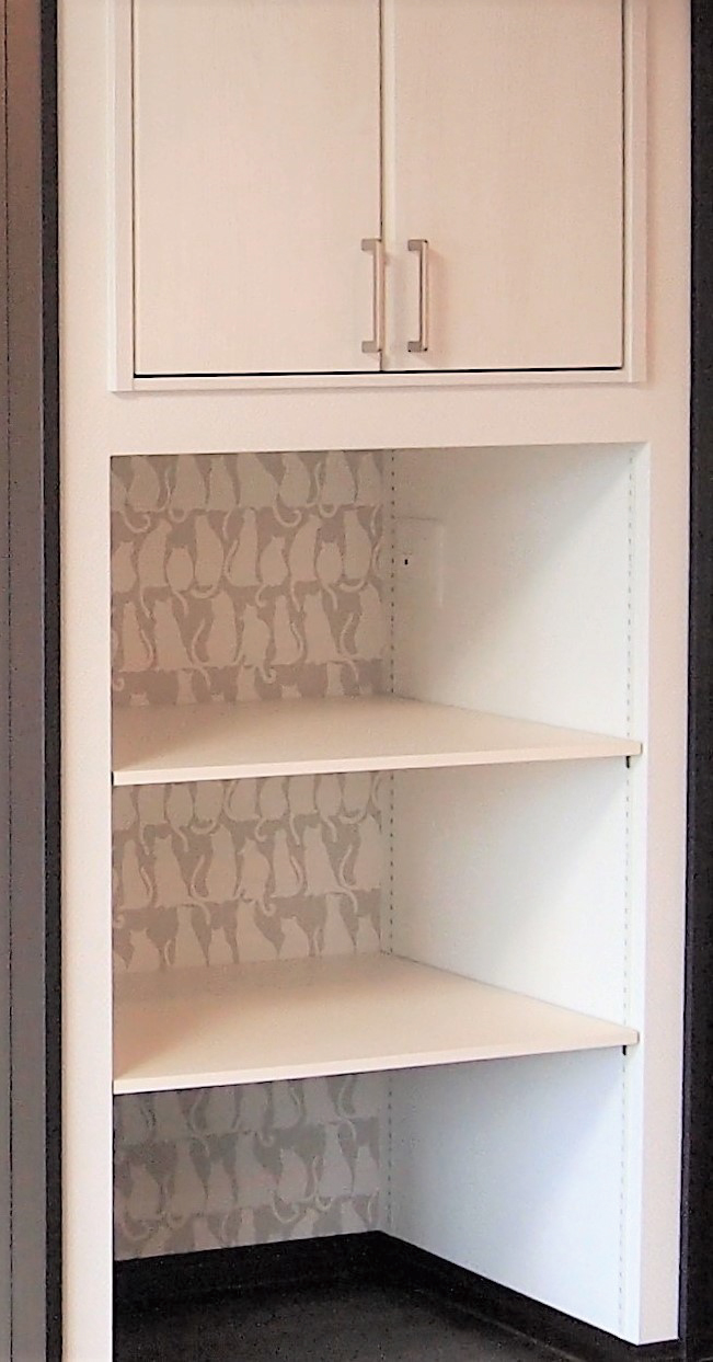 猫柄のクロスを貼ったこのスペースは、猫ちゃん用の小物をストックしたり、トイレを置いたりする猫ちゃんスペースに!