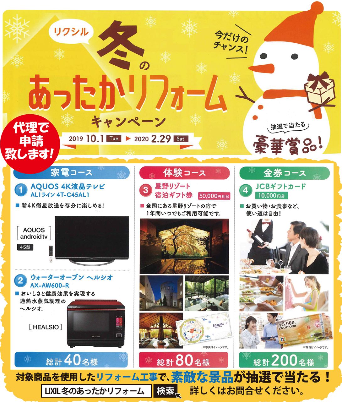 対象商品を使用したリフォーム工事で、素敵な景品が抽選で当たる!