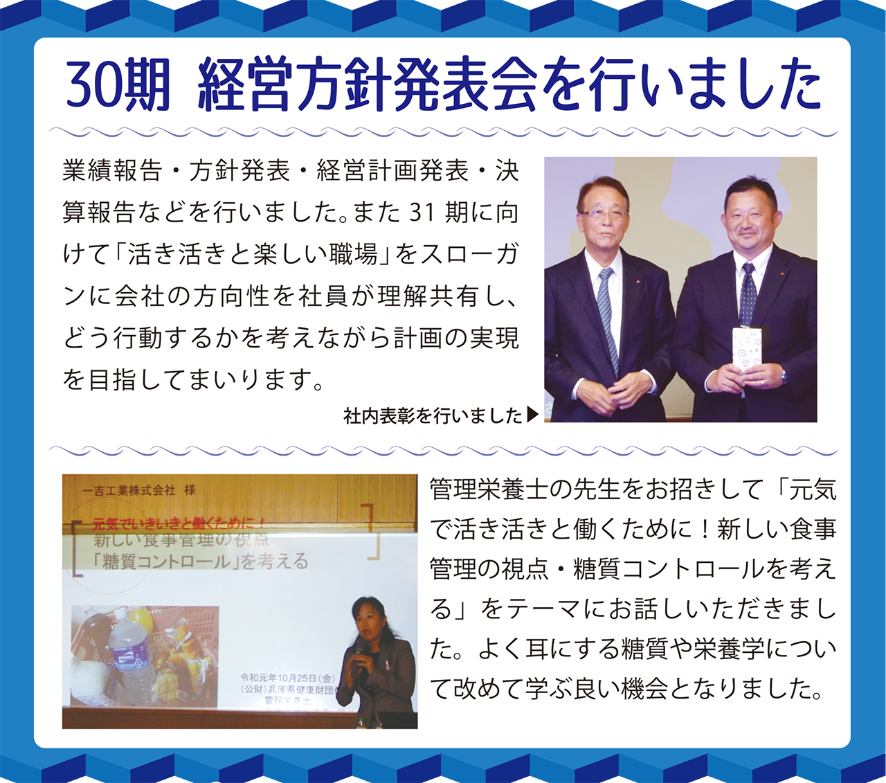 業績報告・方針発表・経営計画発表・決算報告などを行いました。また31期に向けて「活き活きと楽しい職場」をスローガンに会社の方向性を社員が理解共有し、どう行動するかを考えながら計画の実現を目指してまいります。