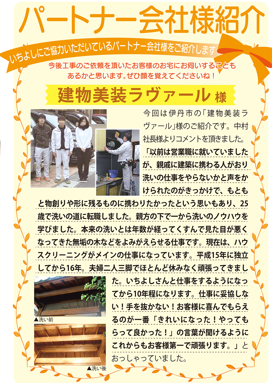 いちよしにご協力いただいているパートナー会社様をご紹介します。今後工事のご依頼を頂いたお客様のお宅にお伺いすることもあるかと思います。是非顔を覚えてくださいね!