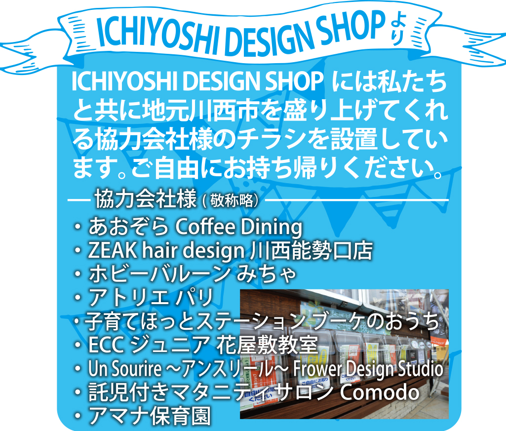 ICHIYOSHI DESIGN SHOP には私たちと共に地元川西市を盛り上げてくれる協力会社様のチラシを設置しています。ご自由にお持ち帰りください。