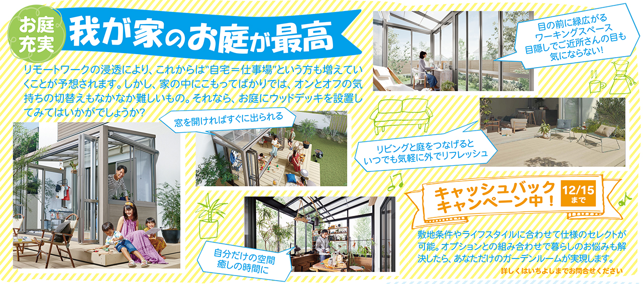 リモートワークの浸透により、これからは“自宅=仕事場”という方も増えてい くことが予想されます。しかし、家の中にこもってばかりでは、オンとオフの気 持ちの切替えもなかなか難しいもの。それなら、お庭にウッドデッキを設置し てみてはいかがでしょうか? 。