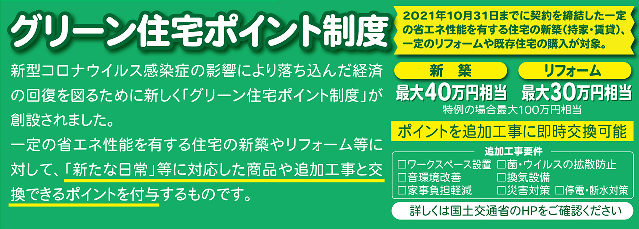 新型コロナウイルス感染症の影響により落ち込んだ経済の回復を図るために新しく「グリーン住宅ポイント制度」が 創設されました。