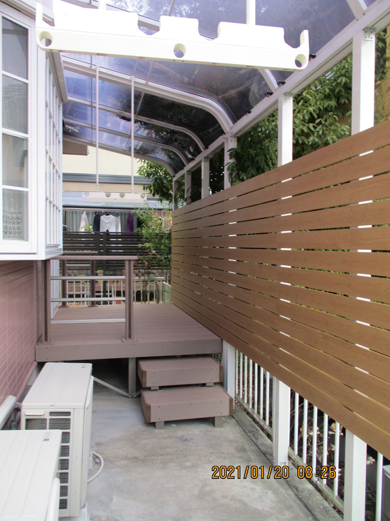 勝手口を出たスペースは一般的には「ゴミ置き場」と呼ぶのだろうけれど今回は「素敵なステキなダストステーション」と名付けてみました。 テラスに目隠しのパネル(LIXILデザイナーズ パーツ)を付けウッドデッキ (LIXILレストステー ジ) を設置。こんなスペース欲しいなー☆彡