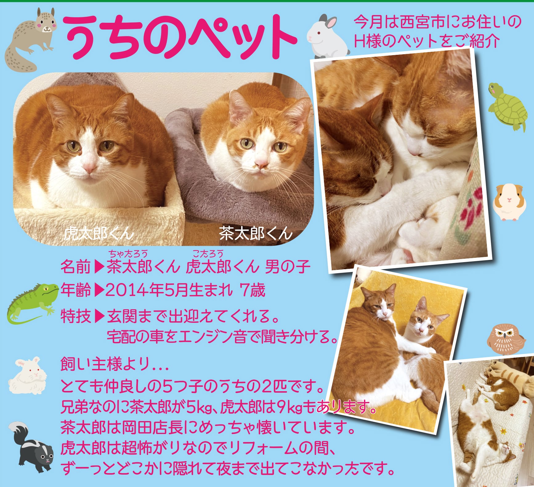 とても仲良しの5つ子のうちの2匹です。 兄弟なのに茶太郎が5kg、虎太郎は9kgもあります。 茶太郎は岡田店長にめっちゃ懐いています。