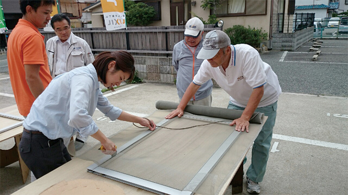 網戸張りの達人?池田の手ほどきを受けながら、真剣に作業されるY様。