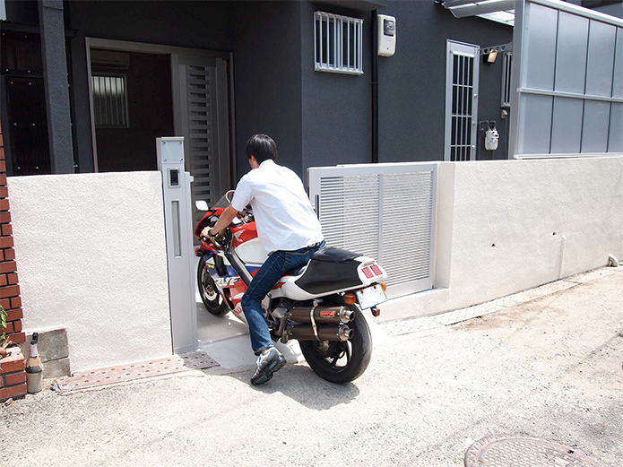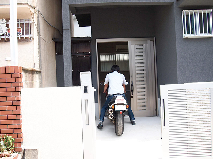 バイクに乗ったまま家に入って行けるんです。