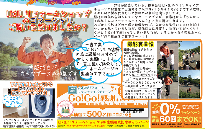弊社が加盟している、株式会社 LIXIL のフランチャイズチェーンの加盟店が出演するCMが9/16から10/6までTV放映。そのCMに関西代表として弊社の和島が出演しましたよ。