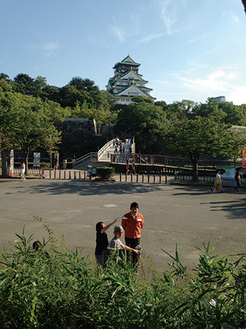 大阪城がきちんとバックに入るように、丸イスの上に乗っかってます。