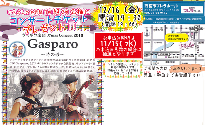 アコーディオンとコントラバスの世界最小楽団「ウミネコ楽団」の名CD「Gasparo」(ガスパロ)のファンタジックな世界をサンドアート(砂絵)のパフォーマンスとともに描く特別な一夜。