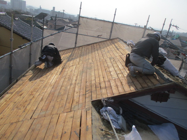 耐震補強に有効な工事にはいろいろあるのですが、今回は屋根の軽量化と筋交いの設置及び耐震金物の取り付けの様子をご紹介しましょう。