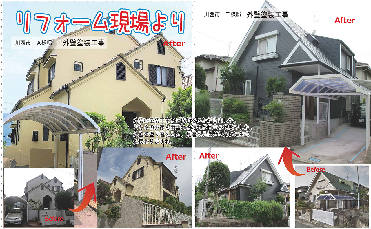 どちらのお家も雨垂れの汚れが目立つ状態でした。外壁を塗り替えると、見違えるほどきれいに生まれ変わりますね。