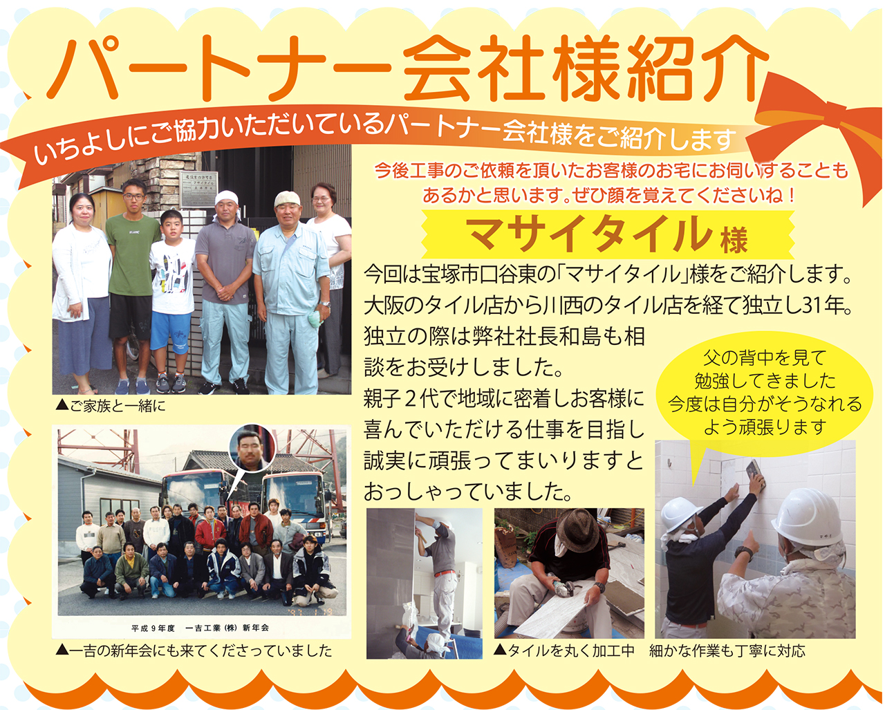 いちよしにご協力いただいているパートナー会社様をご紹介します。今後工事のご依頼を頂いたお客様のお宅にお伺いすることもあるかと思います。是非顔を覚えてくださいね!