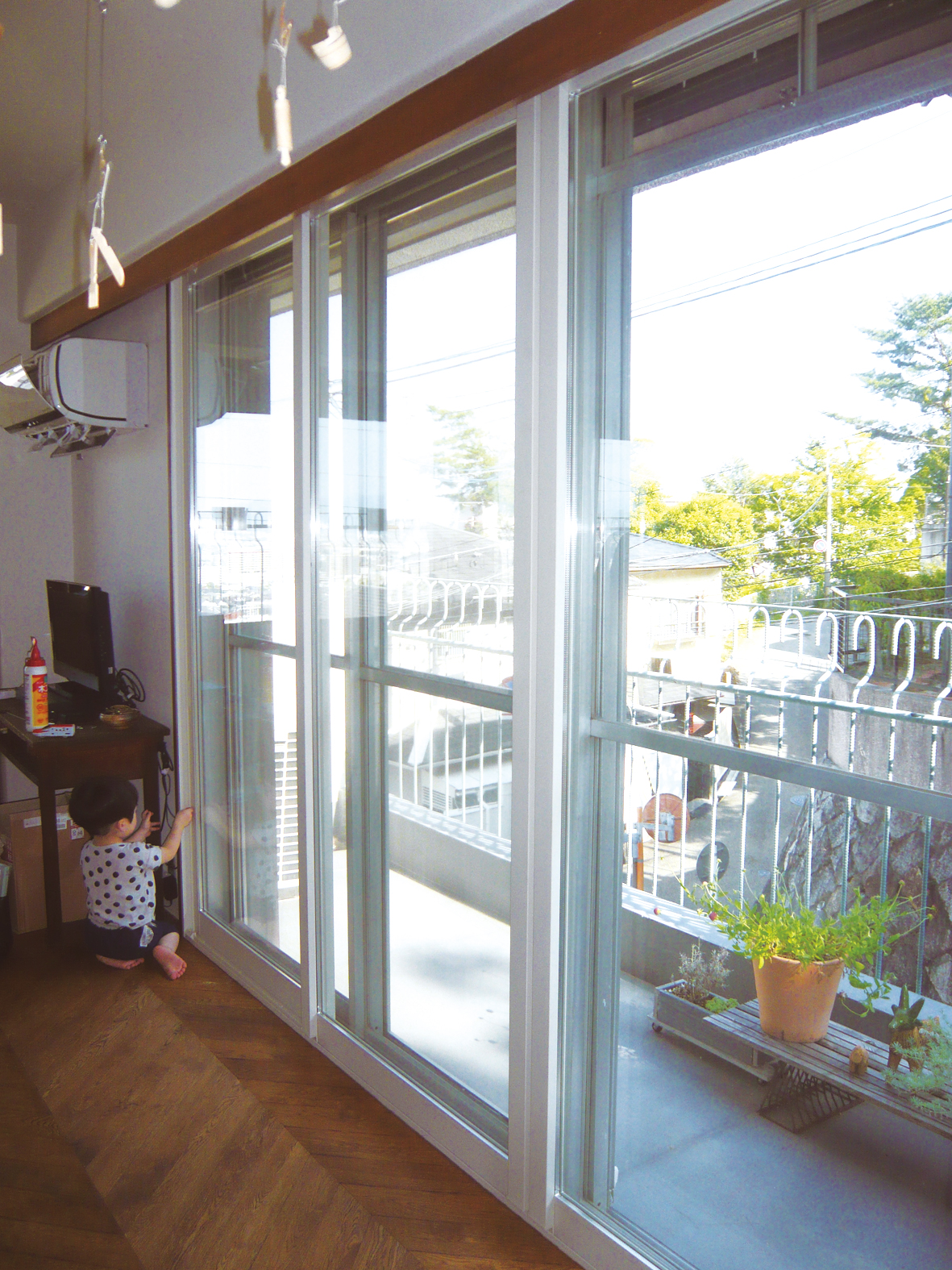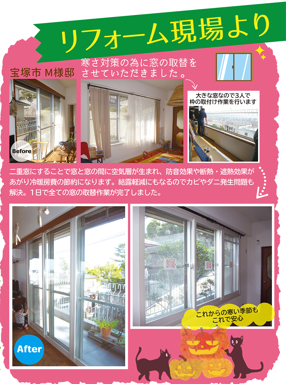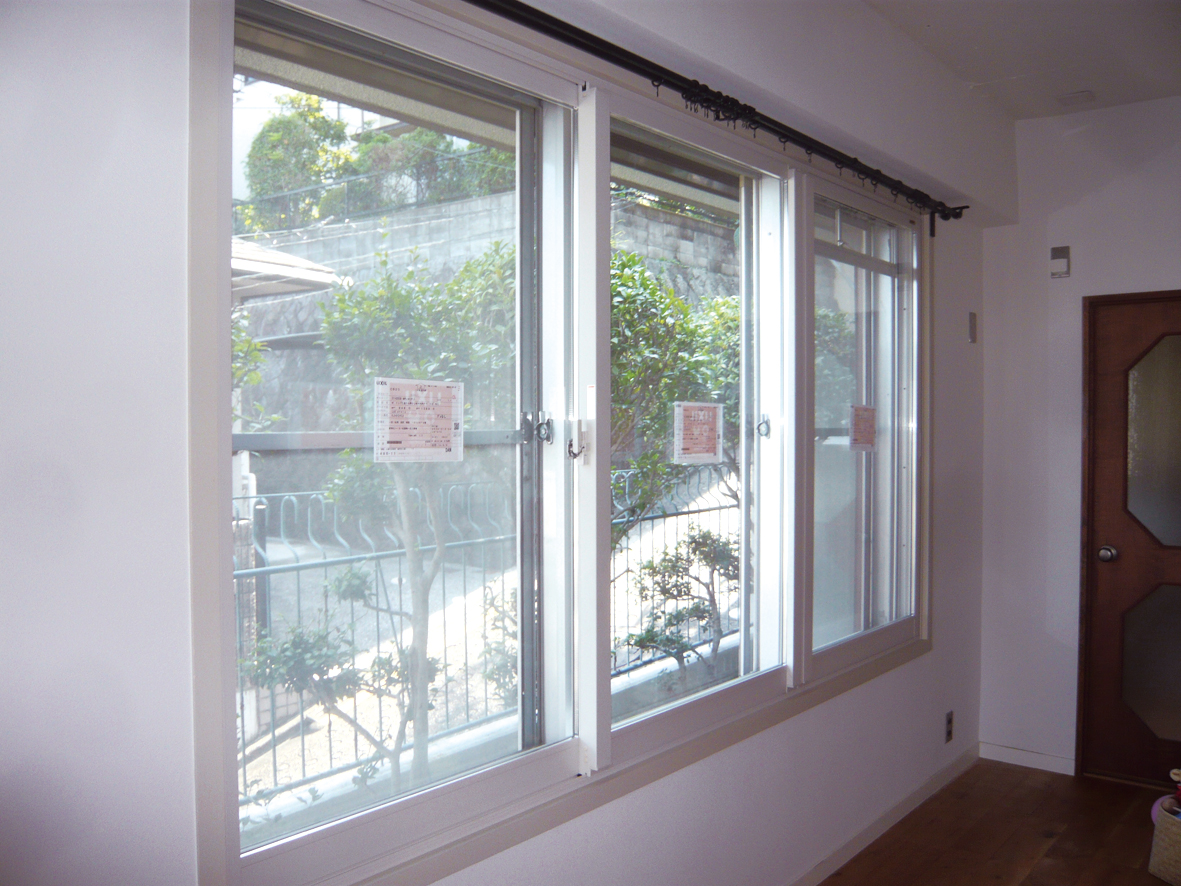二重窓にすることで窓と窓の間に空気層が生まれ、防音効果や断熱・遮熱効果があがり冷暖房費の節約になります。結露軽減にもなるのでカビやダニ発生問題も解決。1日ですべての窓の取替作業が完了しました。