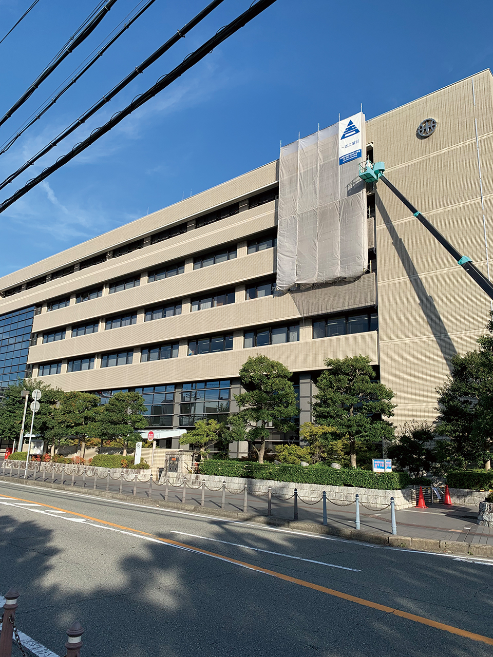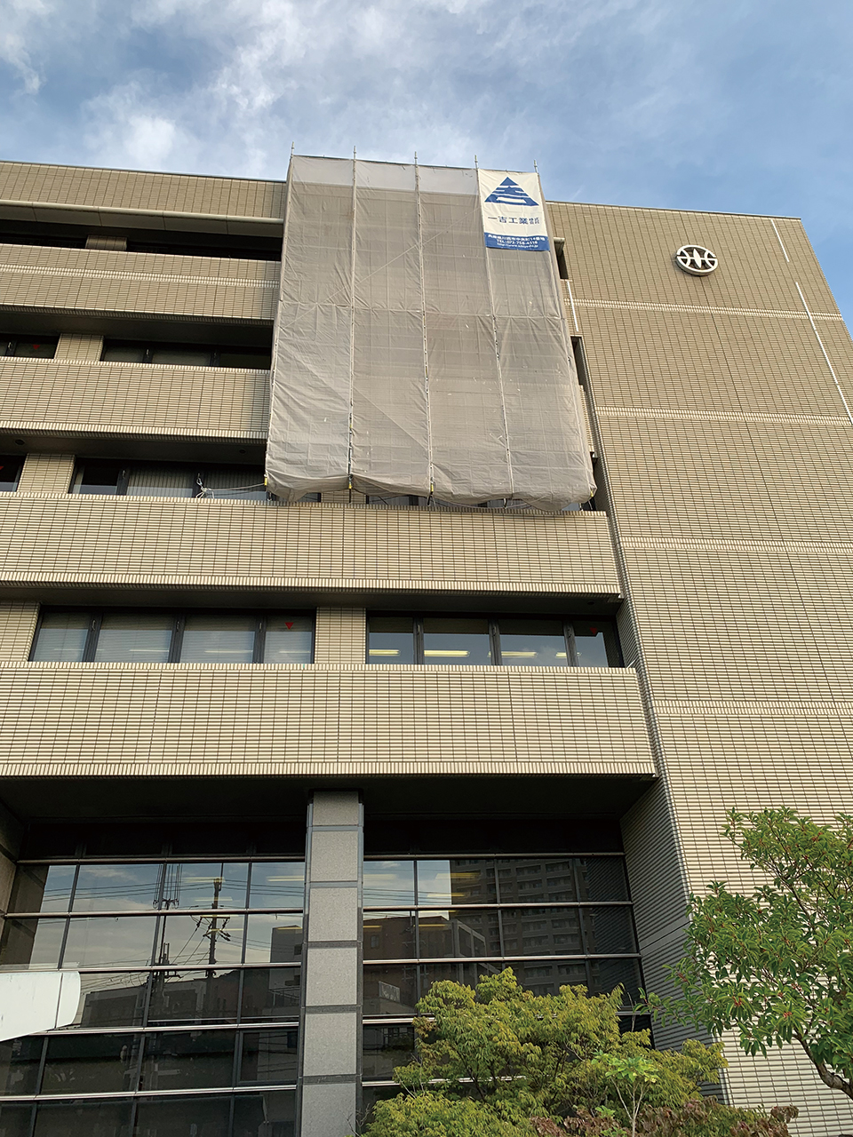 外壁前面に貼られたタイルが印象的ですが、経年劣化により落下する事を防ぐ為、補修工事をさせていただきました。