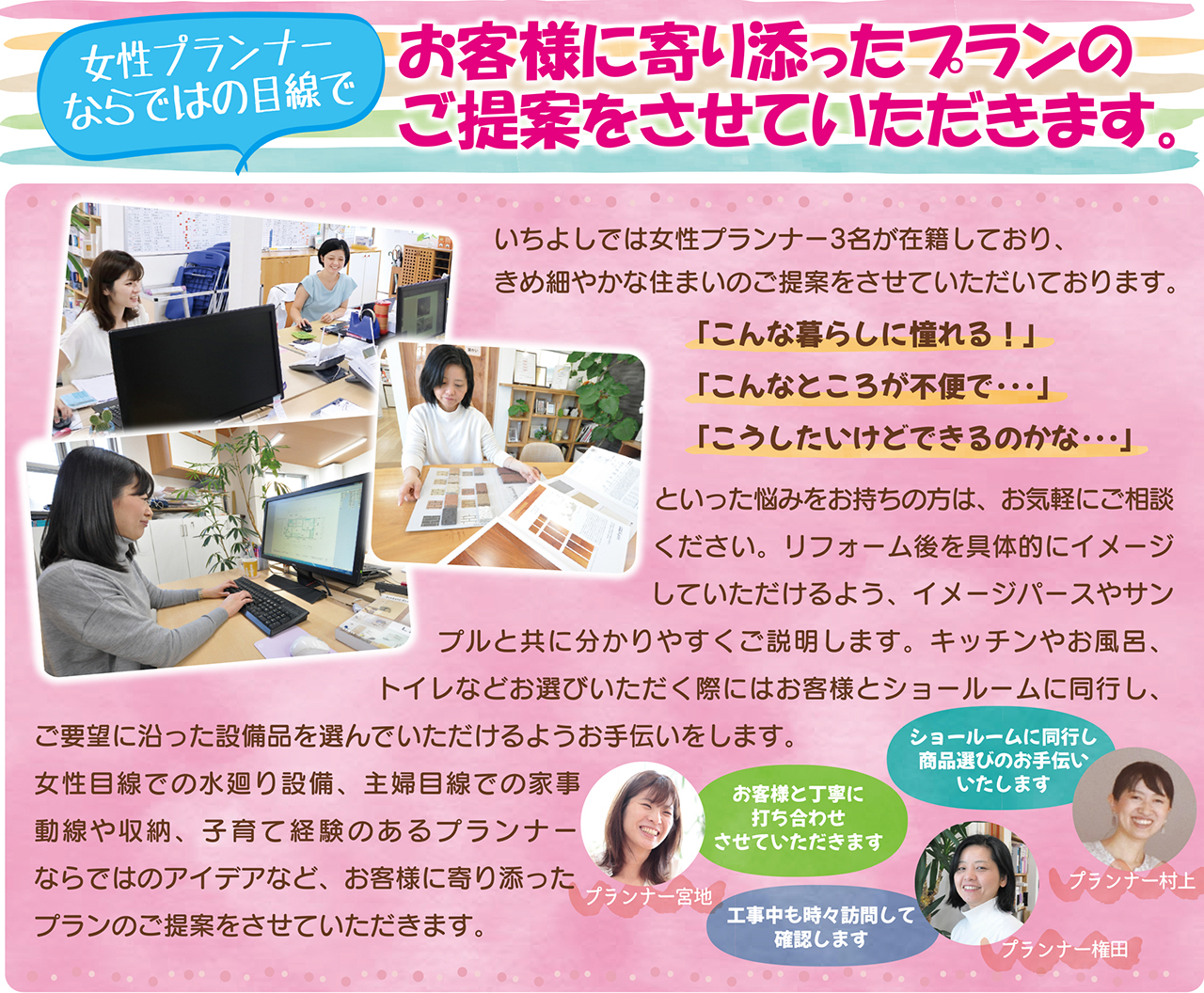 女性目線での水廻り 設備、 主婦目線での家事動線や収納、 子育て経験のあるプランナ ーならではのアイデアなど、 お客様に寄り添ったプランのこ提案をさせていただきます。