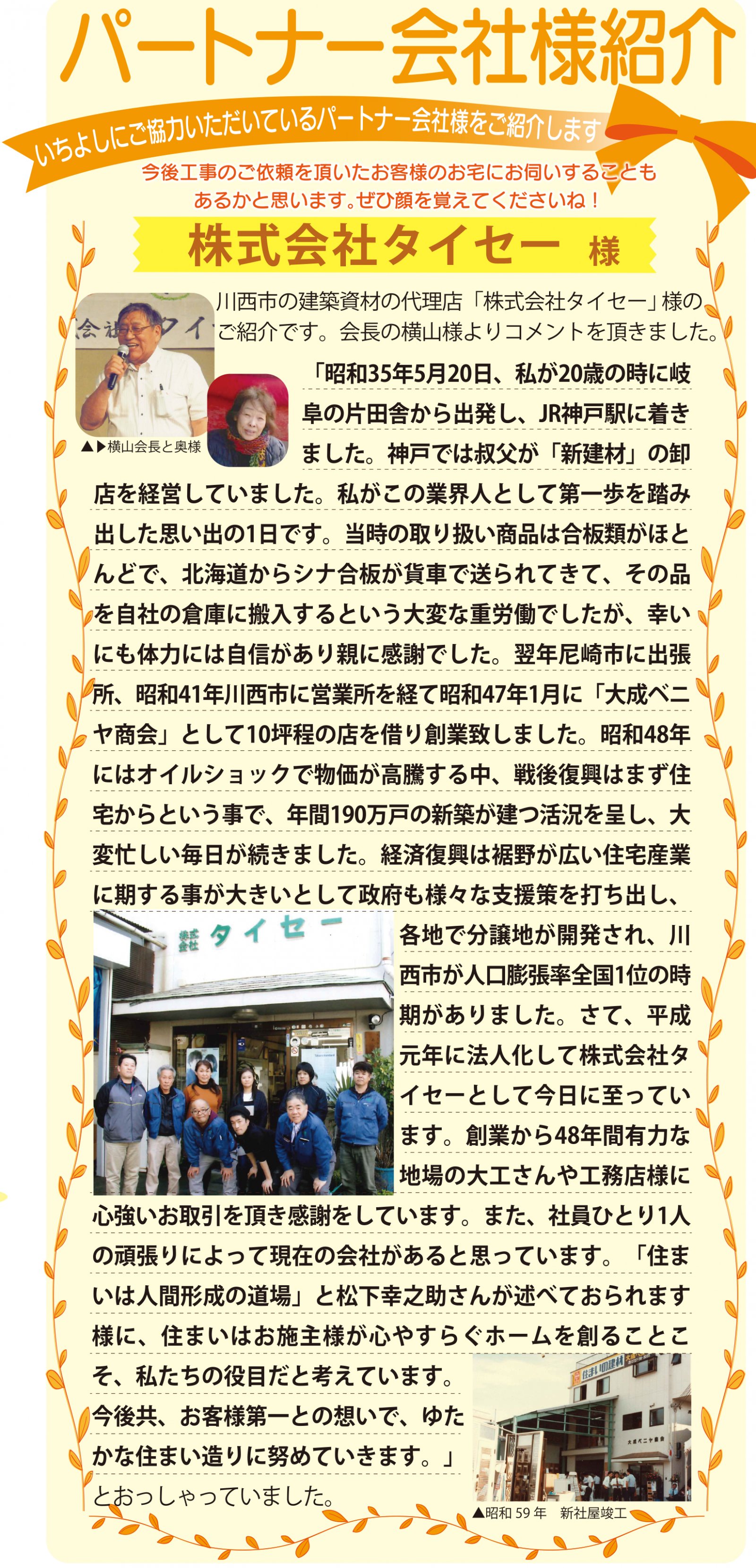 川西市の建築資材の代理店「株式会社タイセー」様のご紹介です。会長の横山様よりコメントを頂きました。