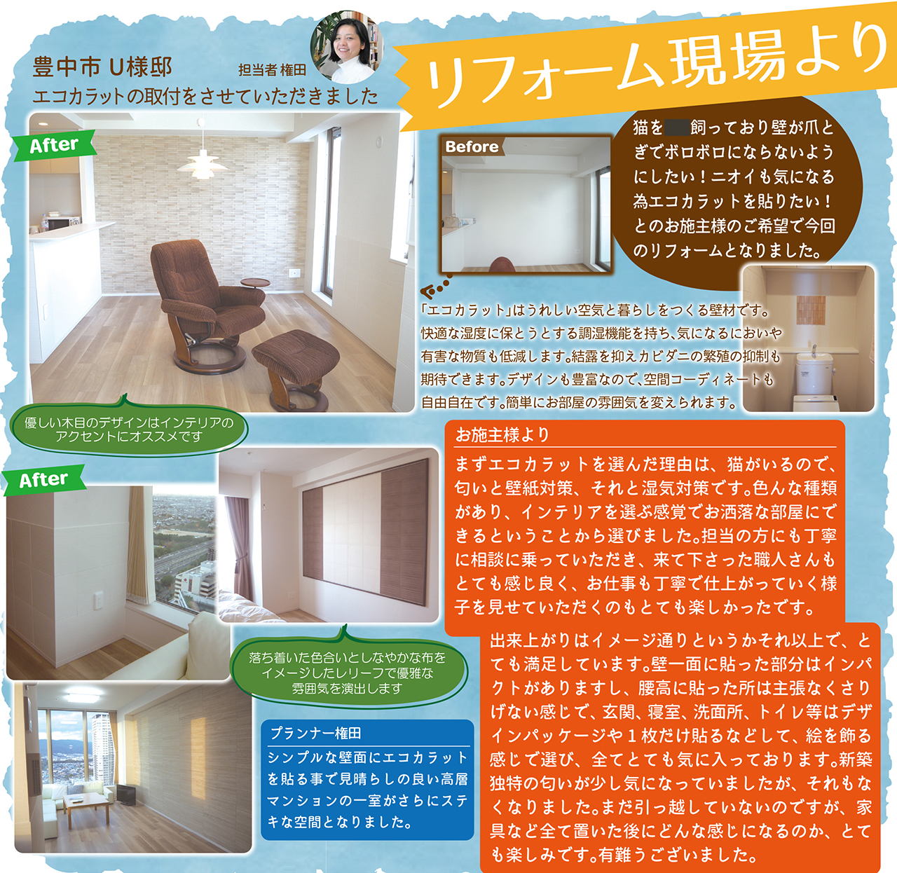まずエコカラットを選んだ理由は、猫がいるので、匂いと壁紙対策、それと湿気対策です。