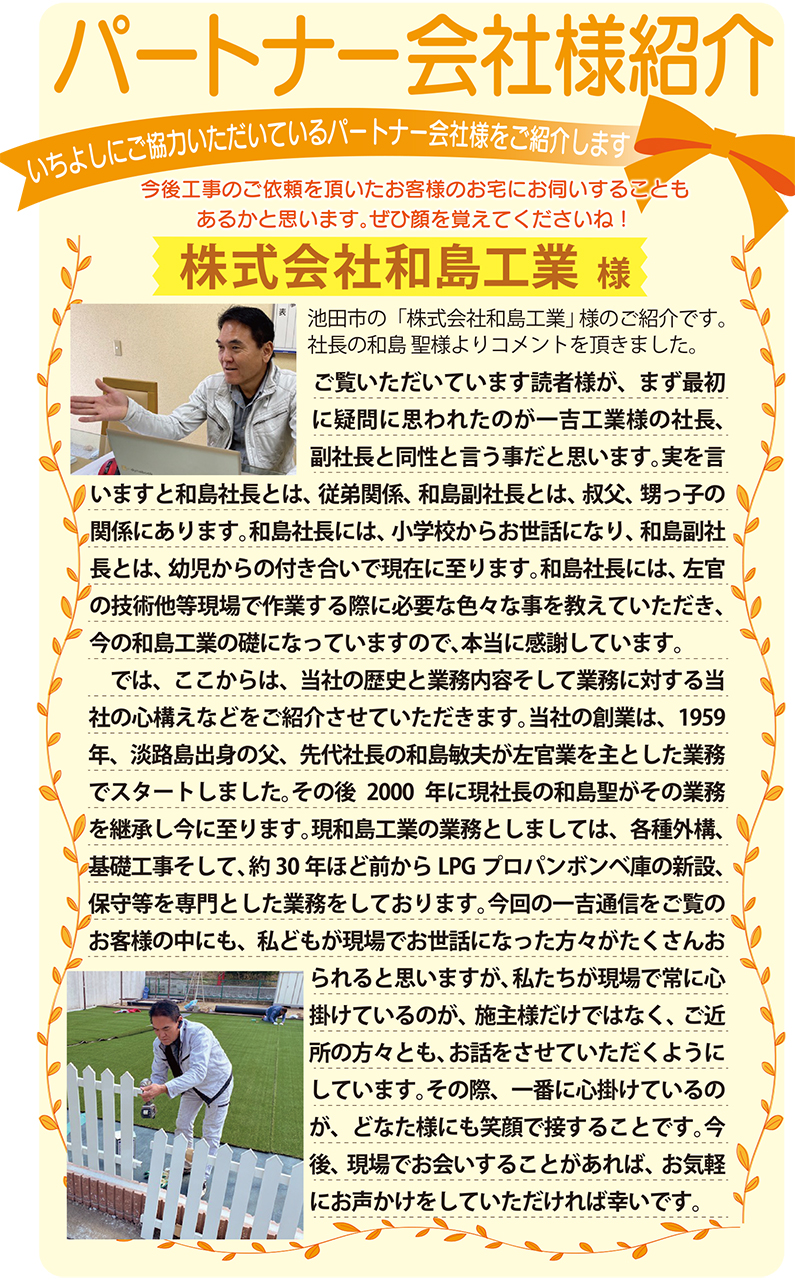 いちよしにご協力いただいているパートナー会社様をご紹介します。今後工事のご依頼を頂いたお客様のお宅にお伺いすることもあるかと思います。是非顔を覚えてくださいね!