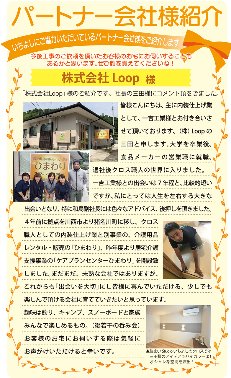 皆様こんにちは、主に内装仕上げ業として、一吉工業様とお付き合いさせて頂いております、(株) Loop の三田と申します。大学を卒業後、食品メーカーの営業職に就職、 退社後クロス職人の世界に入りました。