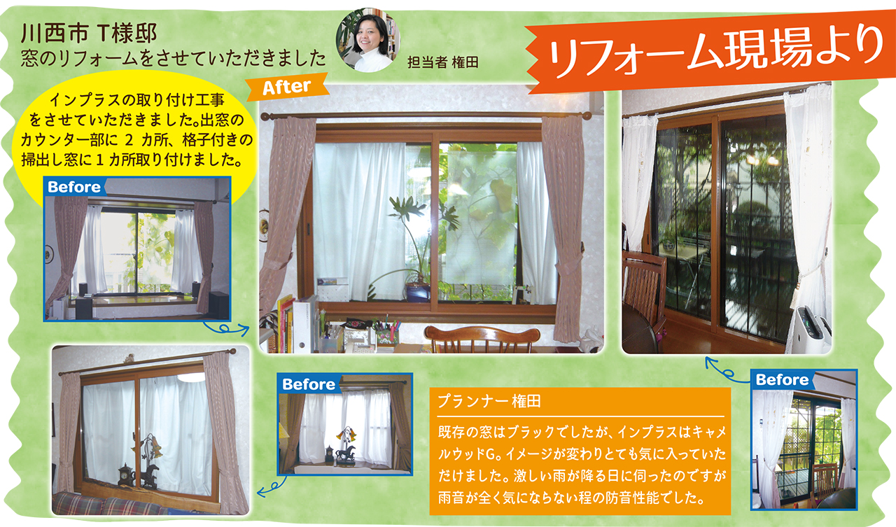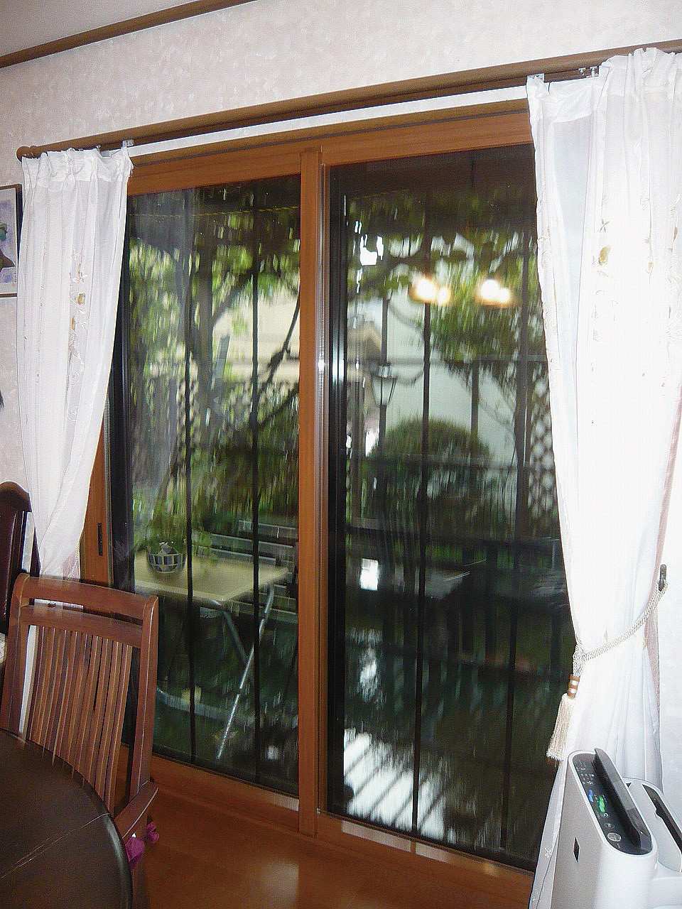既存の窓はブラックでしたが、インプラスはキャメ ルウッドG。イメージが変わりとても気に入っていた だけました。激しい雨が降る日に伺ったのですが 雨音が全く気にならない程の防音性能でした。