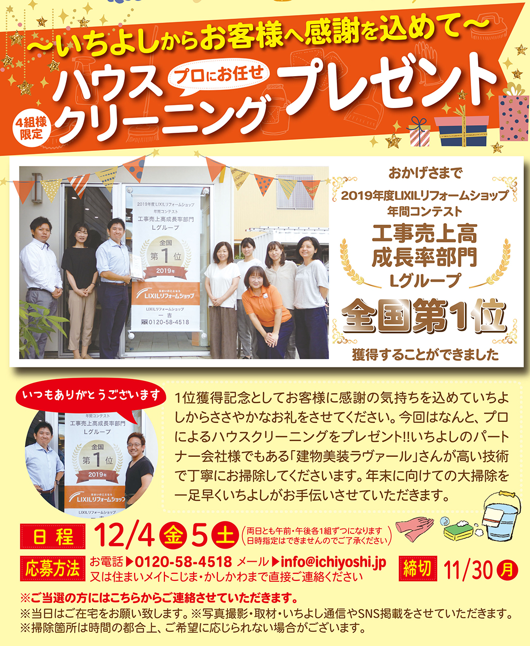 1位獲得記念としてお客様に感謝の気持ちを込めていちよしからささやかなお礼をさせてください。今回はなんと、プロ によるハウスクリーニングをプレゼント!!いちよしのパート ナー会社様でもある「建物美装ラヴァール」さんが高い技術 で丁寧にお掃除してくださいます。年末に向けての大掃除を 一足早くいちよしがお手伝いさせていただきます。