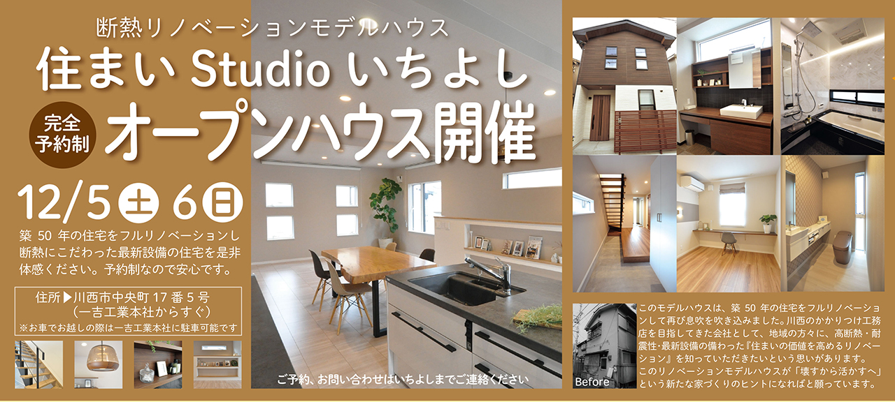 このモデルハウスは、築 50 年の住宅をフルリノベーショ ンして再び息吹を吹き込みました。川西のかかりつけ工務 店を目指してきた会社として、地域の方々に、高断熱・耐 震性・最新設備の備わった『住まいの価値を高めるリノベー ション』を知っていただきたいという思いがあります。 このリノベーションモデルハウスが「壊すから活かすへ」 という新たな家づくりのヒントになればと願っています。