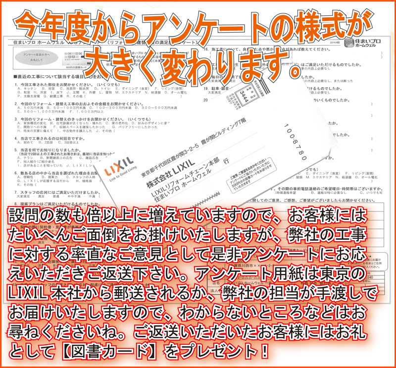設問の数も倍以上に増えていますので、お客様には大変ご面倒をお掛け致しますが、弊社の工事に対する率直なご意見として是非アンケートにお答えいただきご返送下さい。アンケート用紙は東京のLIXIL本社から郵送されるか、弊社の担当者が手渡しでお届致しますので、わからないところなどはお尋ねくださいね。ご返送いただいたお客様にはお礼として[図書カード]をプレゼント!!!