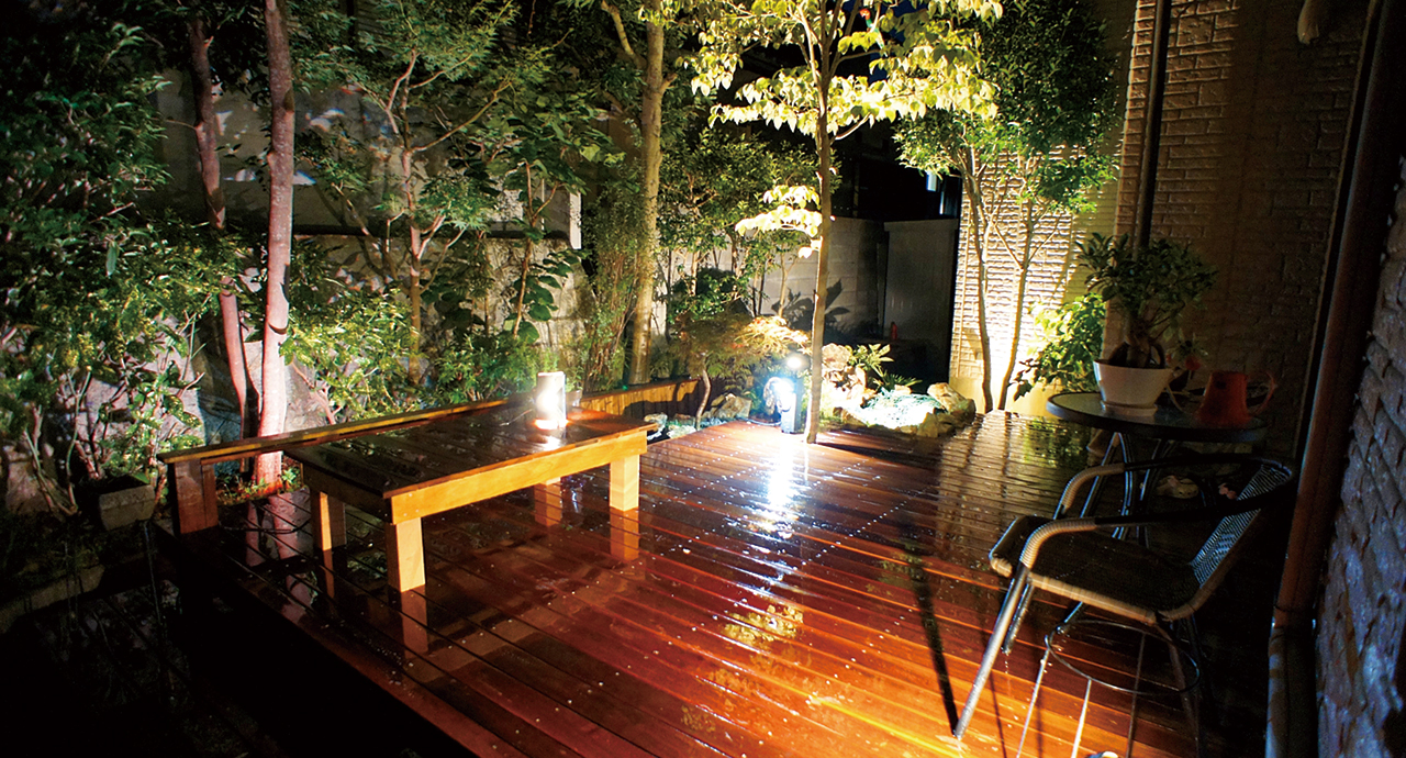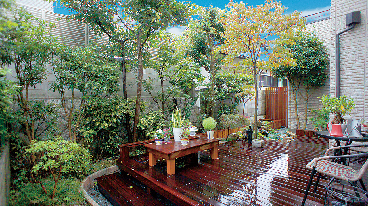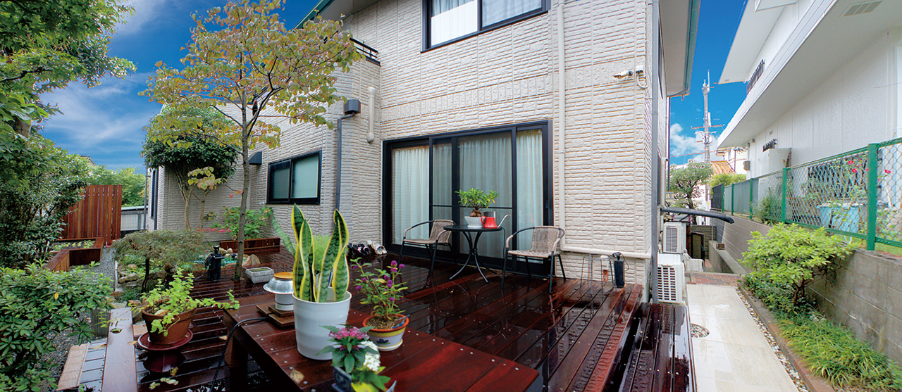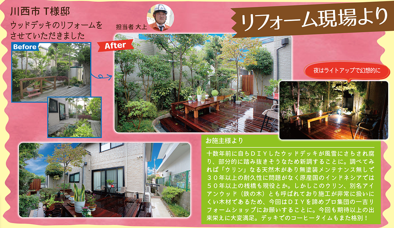 十数年前に自らDIYしたウッドデッキが風雪にさらされ腐り、部分的に踏み抜きそうなため新調することに。調べてみ れば「ウリン」なる天然木があり無塗装メンテナンス無しで 30年以上の耐久性に問題がなく原産国のインドネシアでは 50年以上の桟橋も現役とか。しかしこのウリン、別名アイ アンウッド(鉄の木)とも呼ばれており施工が非常に扱いに くい木材であるため、今回はDIYを諦めプロ集団の一吉リフォームショップにお願いすることに。今回も期待以上の出 来栄えに大変満足。デッキでのコーヒータイムもまた格別!