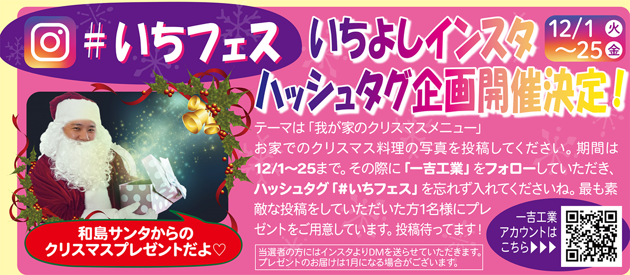 テーマは「我が家のクリスマスメニュー」 お家でのクリスマス料理の写真を投稿してください。期間は 12/1~25まで。その際に「一吉工業」をフォローしていただき、 ハッシュタグ「#いちフェス」を忘れず入れてくださいね。最も素敵な投稿をしていただいた方1名様にプレ ゼントをご用意しています。投稿待ってます!