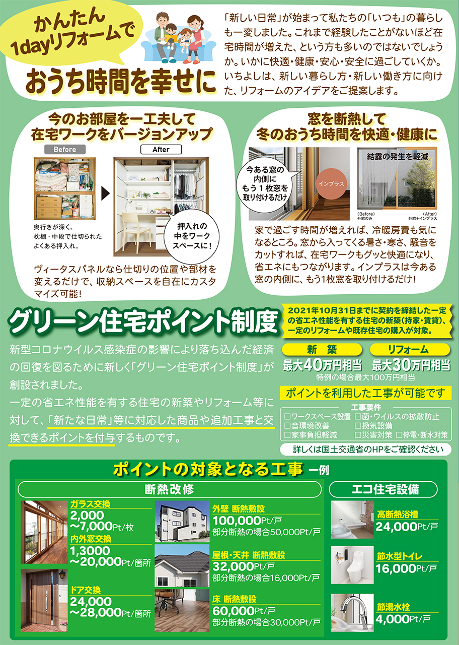 一定の省エネ性能を有する住宅の新築やリフォーム等に「新たな日常」等に対応した商品や追加工事と交換できるポイントを付与するものです。