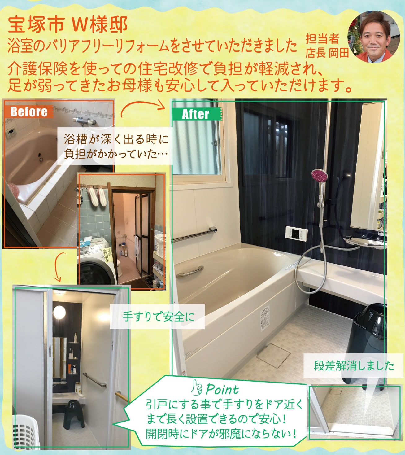 介護保険を使っての住宅改修で負担が軽減され、足が弱ってきたお母様も安心して入っていただけます。