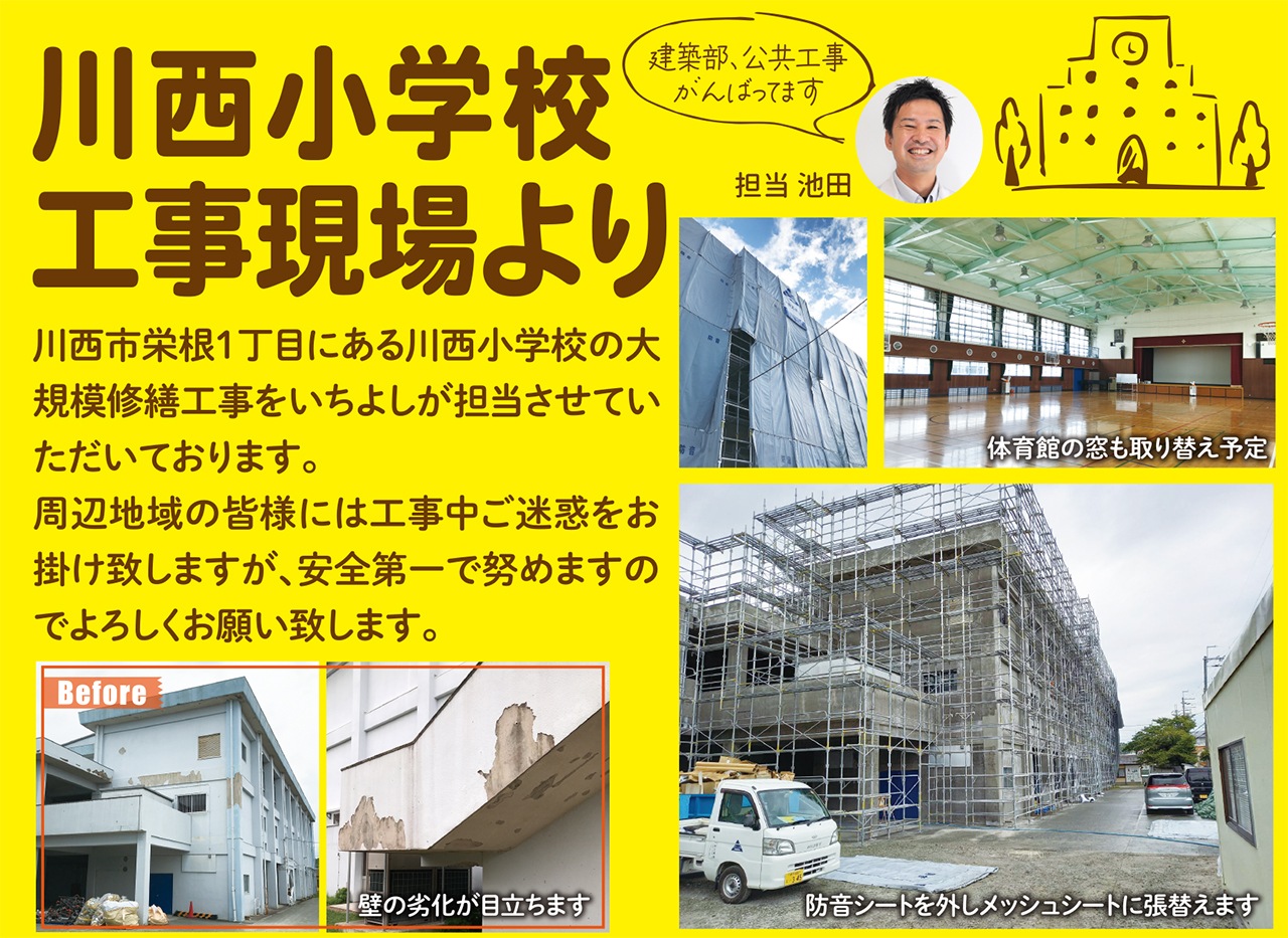 川西市栄根1丁目にある川西小学校の大 規模修繕工事をいちよしが担当させていただいております。