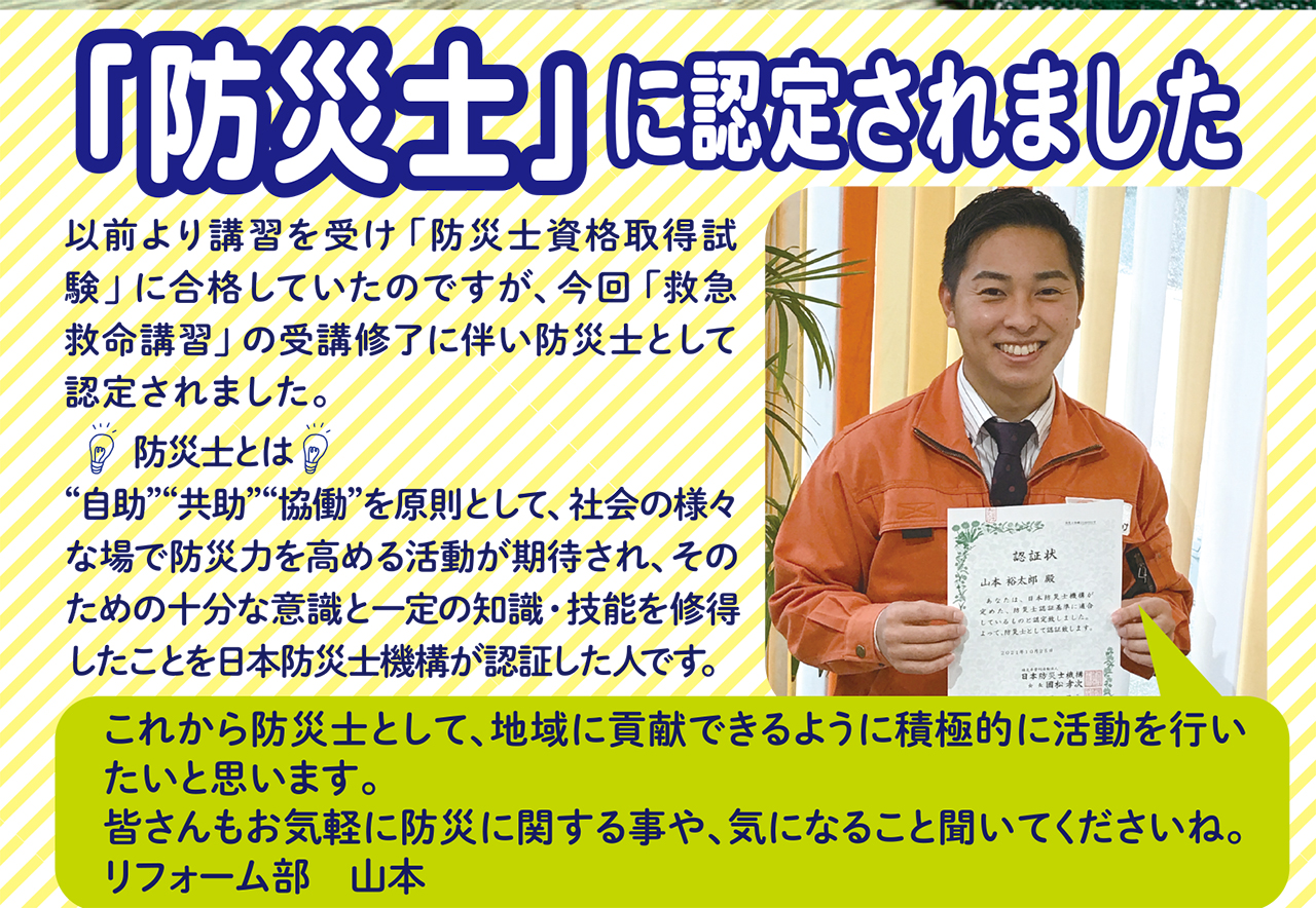 皆さんもお気軽に防災に関する事や、気になること聞いてくださいね。 リフォーム部 山本