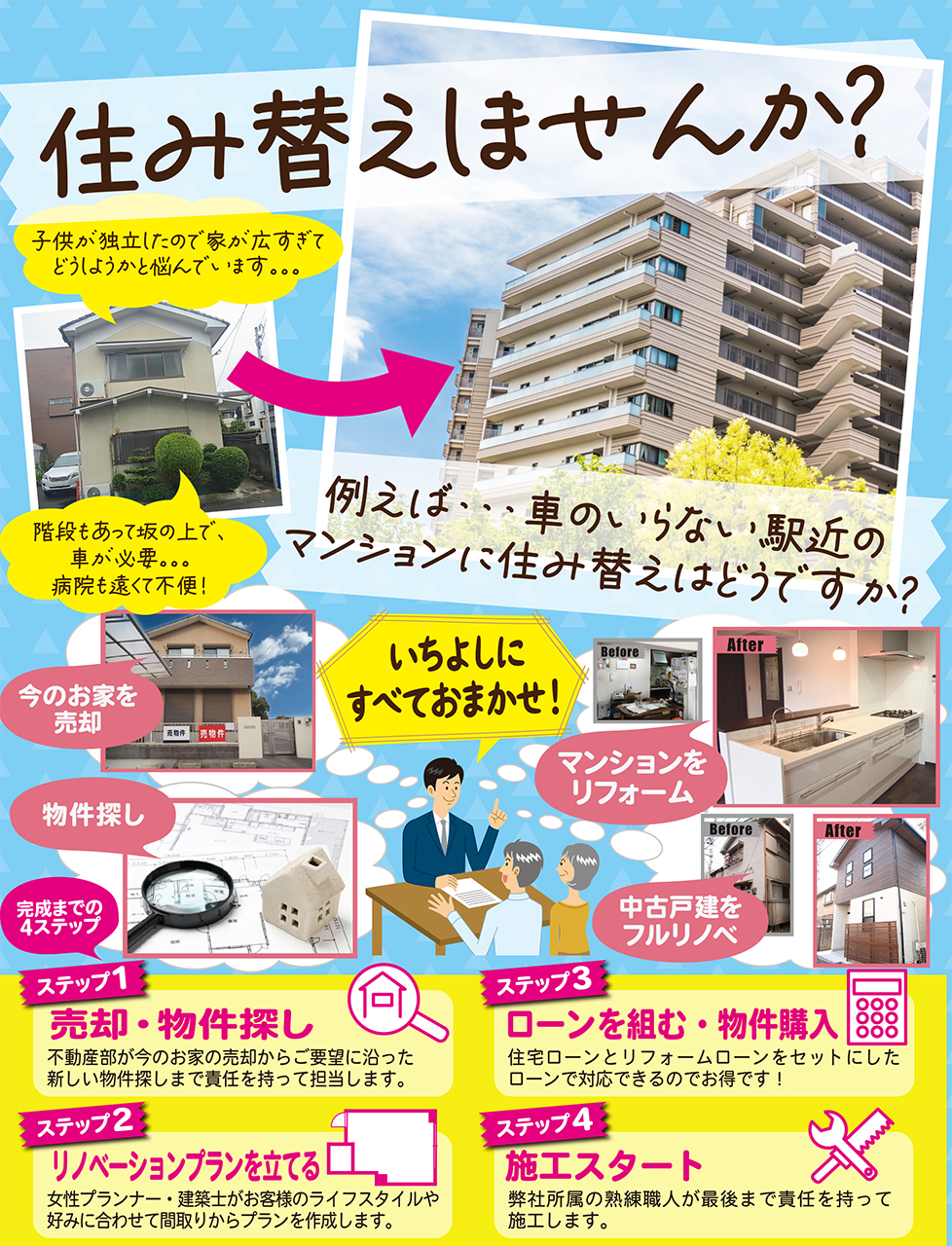 不動産部が今のお家の売却からご要望に沿った 新しい物件探しまで責任を持って担当します。