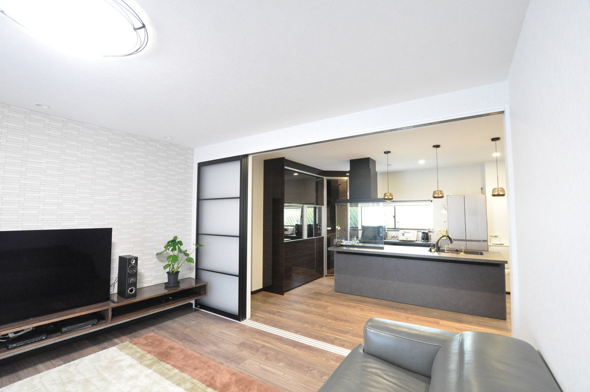間取りの変更で、応接室とキッチンダイニングにあった廊下をなくし、つながりのある大きな空間ができました。