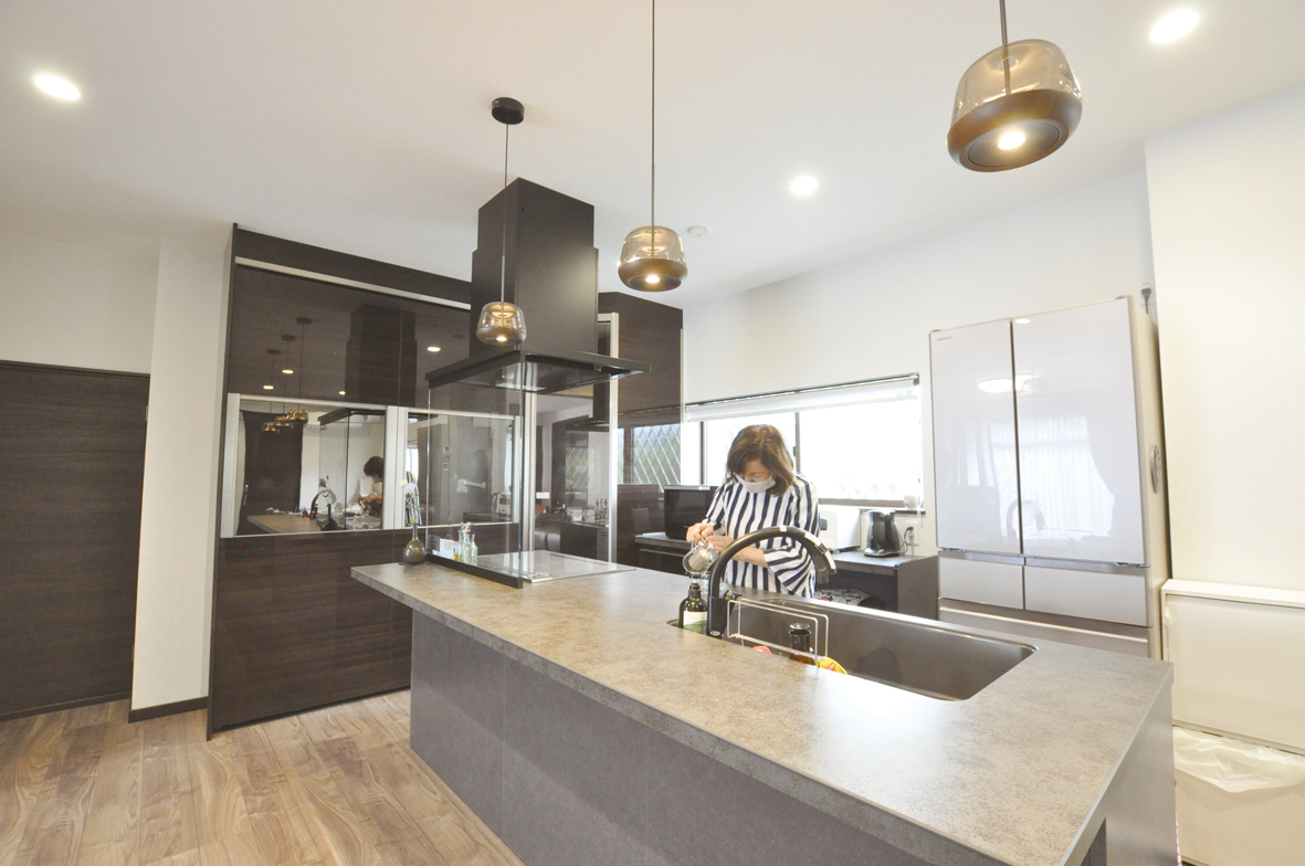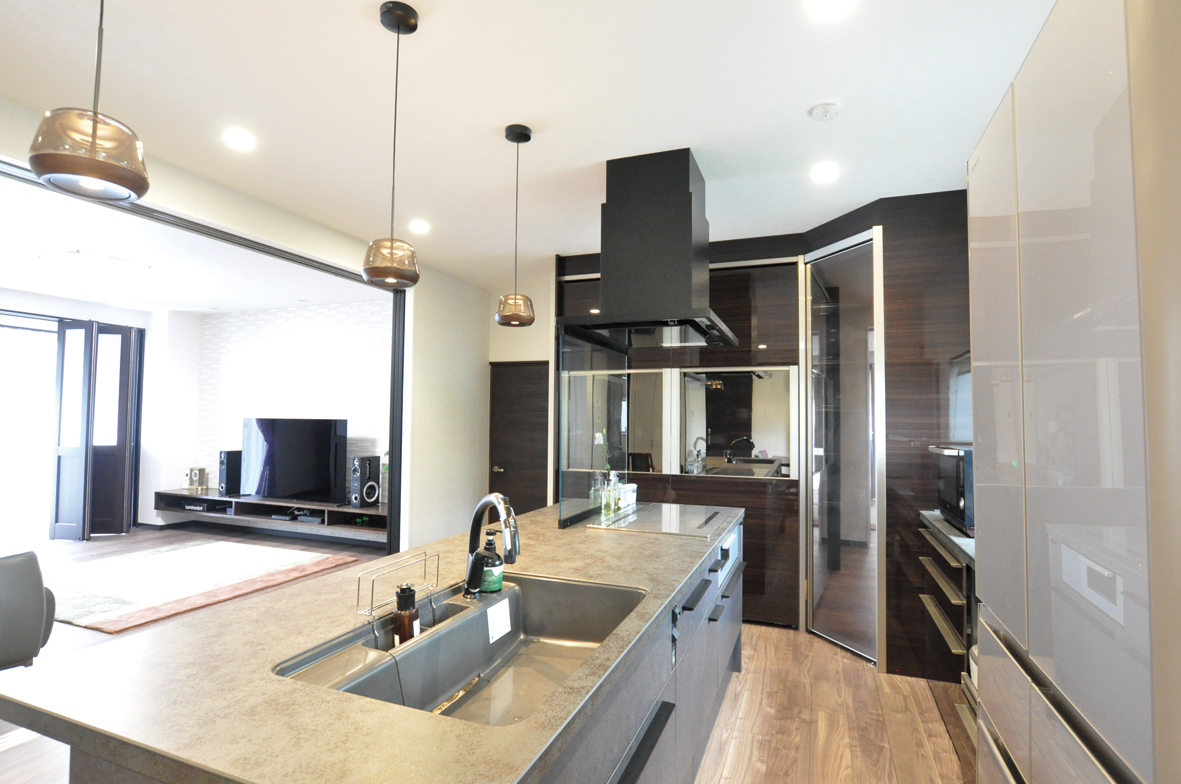 奥様のお気に入りは何といってもキッチン!L字に配置された食器棚・パントリーは収納力・使い勝手も抜群。