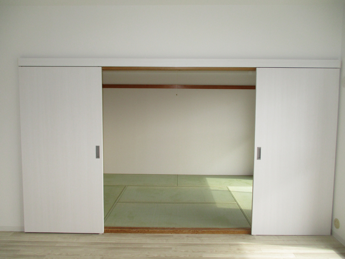 お子様の事を考えての商品選びと、センスが光るスッキリとした色合いが素敵です!ベランダからの眺めも最高なお宅です!! お子様の様子がよく見えるように キッチンとリビングとの間仕切り 壁の開口を大きく・・・ 和室とリビングとの 間の引違いの襖を アウトセット両引き扉 (Panasonicリビエラ) にする事でデザイン 性UP!開口も広くなりお子様の様子も確認しやす LIXILラシッサD チェストナット ほこりが立たないようにじゅうたんをフローリングに取替 LIXILリノビオV 小さなお子様の事を考えて 浴室ドアは折戸ではなく引戸に キッチン側からリビングがしっかり見える。