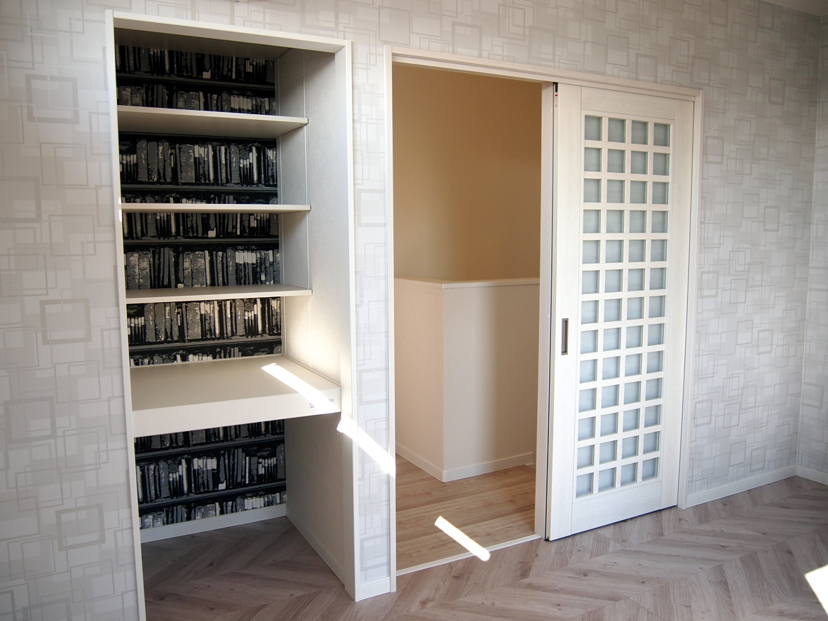 築34年のお宅をリノベーションさ せていただきました。 1階は廊下をなくILDKを広げ、寝室 も引き分け戸でOPENな空間に。 2階は娘さんのスペースとして、 ワークスペースやライブラリー、 和室の寝室があります。 外壁・屋根・水回りと全て取替し、 新築のように生まれ変わりました。