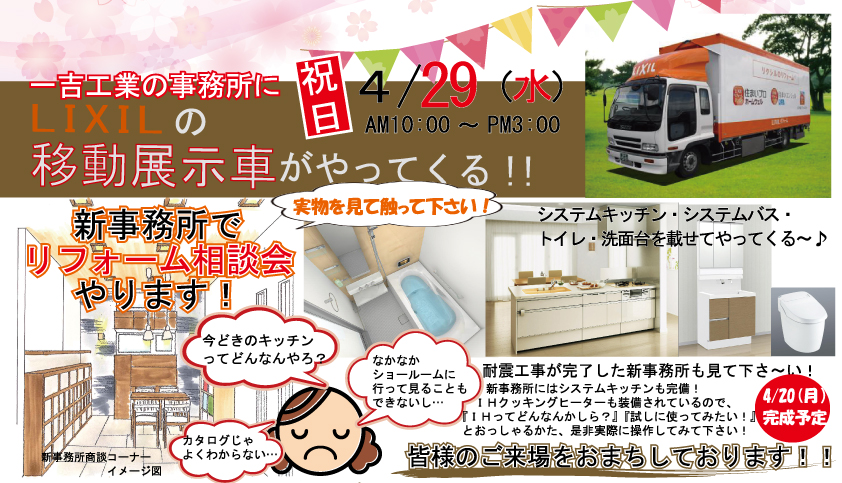 4月29日(水)一吉工業の事務所にLIXILの移動展示車がやってくる!!