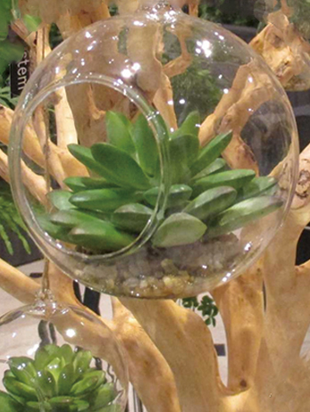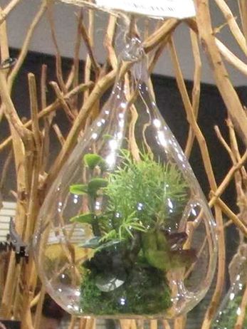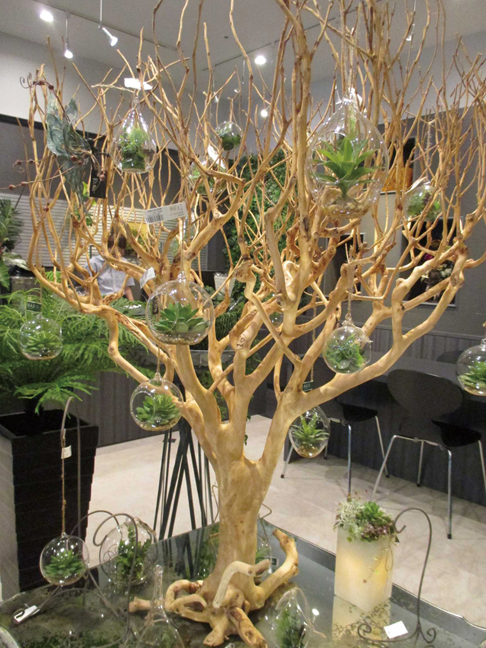 多肉植物や最近流行のエアーブラシが入ったガラスの容器が吊り下げられていて、スタイリッシュ感もあり、可愛さもありでとてもいい感じです。