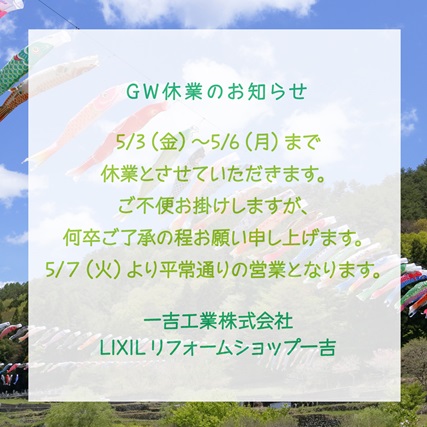 5/3(金) ~5/6(月)まで 休業とさせていただきます。