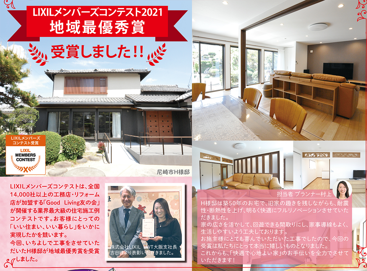 お施主様にとても喜んでいただいた工事でしたので、今回の受賞は私たちにとって本当に嬉しいものとなりました。